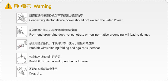在使用前请检查所连接的电器设备的总功率,以确保总功率不超过额定功率(2500W),避免因电器设备的总功率超过额定功率引发危险!