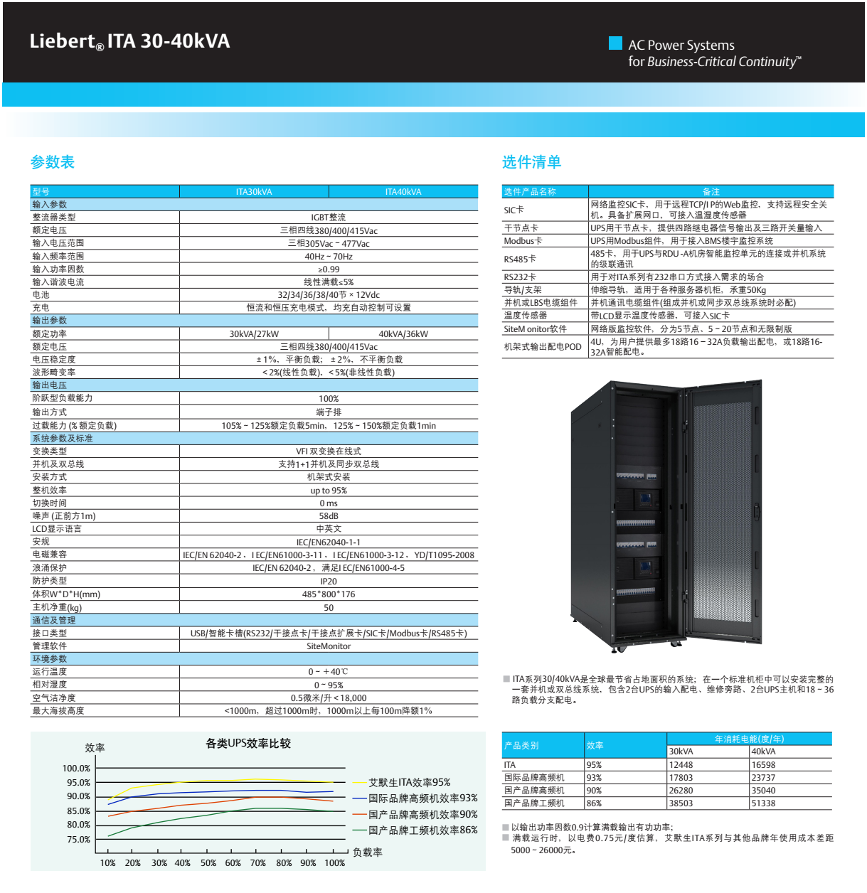 绿色电源: ITA 系列 UPS 采用 IGBT 整流技术,输入功率因数 >0.99 ,输入谐波电流< 5% ,电网污染小,油机适配性好 节能高效