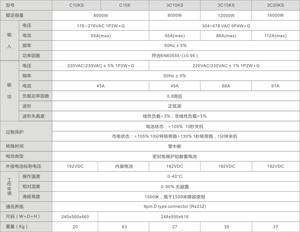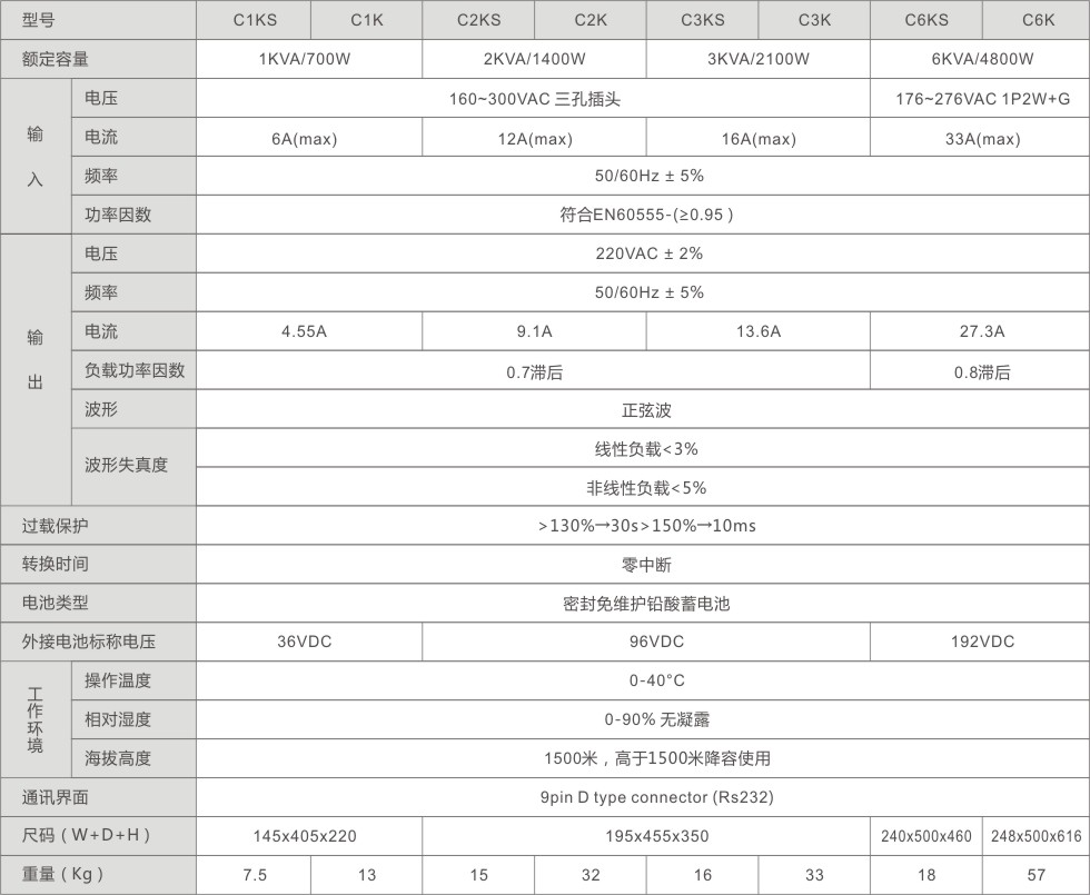 产品特点: C/3C 系列充分凝聚了 UPS 尖端技术精华,整机采用先进的 16 位高速 CPU 控制及 40KHZ 高频技术,体积小,重量轻,工作效率高;零转换与纯正弦波输出
