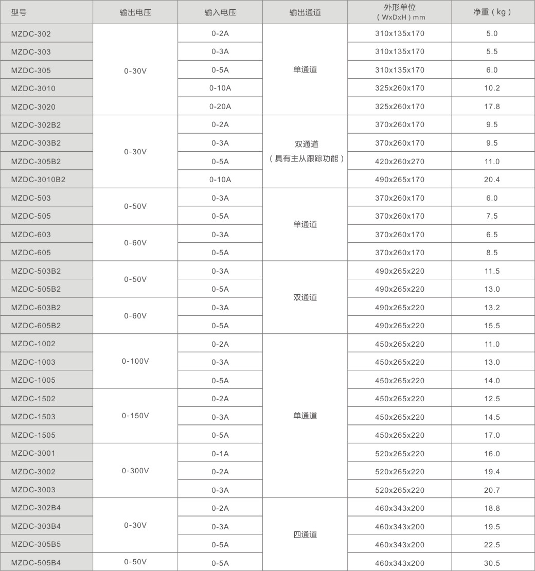 MZDC 系列产品概述 MZDC 系列直流稳压电源的电路结构为线性串联调整式,具有稳定性高,纹波电压低的优点。 采用基准电压悬浮加式技术,输出电压