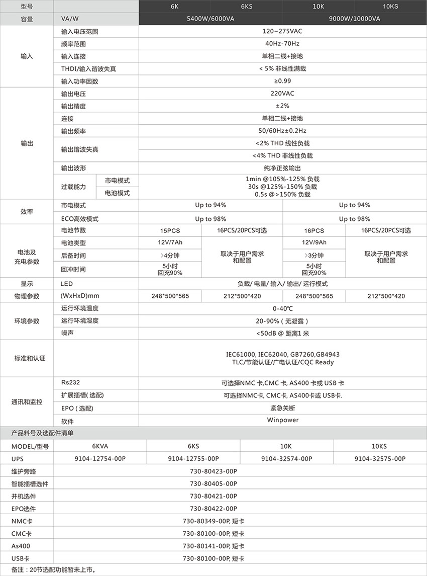 C6-10kVA 是一款继承上一代城堡系列UPS 的优秀品质,并在其基础上表现更加出色的双转换在线式UPS。在有效解决9 种电力问题(断电、市电电压过高或过低、电压瞬间跌落或减幅震荡、高压脉冲、电压波动、浪涌电压、谐波失真、杂波干扰、频率波动)的基础上,C6-10kVA大幅提高了其在可靠性、高效性、适应性和灵活性等方面的表现,全方位满足了用户对稳定且不间断电力的需求。同时,其所具备的丰富的可扩展功能,也为满足用户的个性化需求提供了保障。